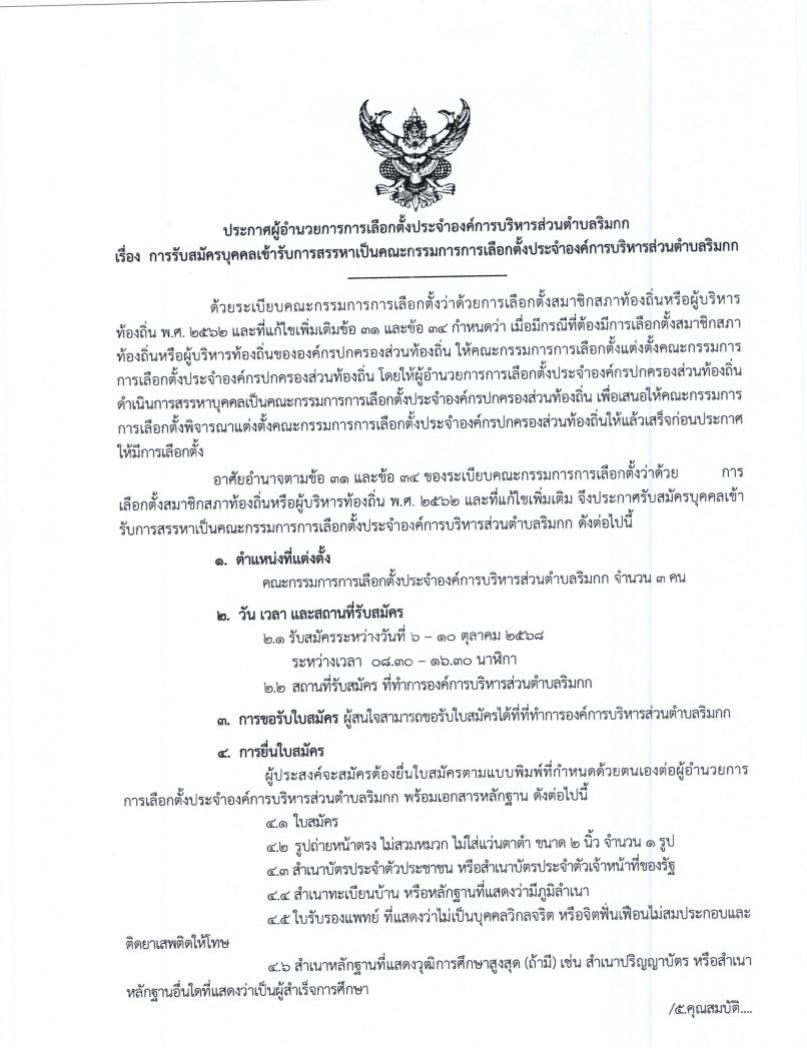 ประกาศรับสมัครบุคคลเข้ารับการสรรหาเป็นคณะกรรมการการเลือกตั้งประจำองค์การบริหารส่วนตำบลริมกก...