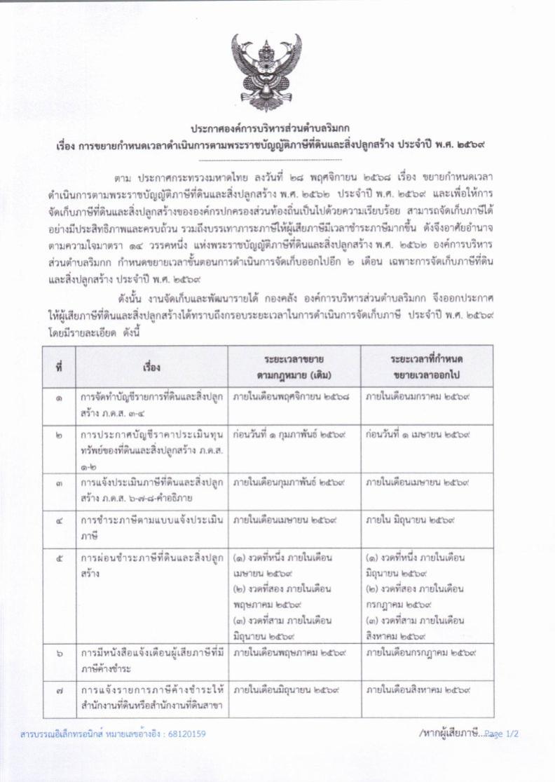 ประกาศองค์การบริหารส่วนตำบลริมกก เรื่อง การขยายกำหนดเวลาดำเนินการตามพระราชบัญญัติภาาีที่ดินและสิ่งปลูกสร้าง ประจำปี พ.ศ. 2569...
